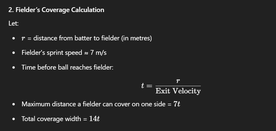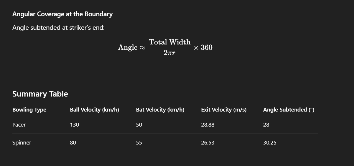 Fielder Restrictions: Now, this is a part where good fielding data would have been of great help. What I wanted to know was an approximate angle coverage value (subtended at the center) that an average fielder is expected to cover. Due to the lack of such data, I had to dig for some values through which I could approximate this. This is the working: