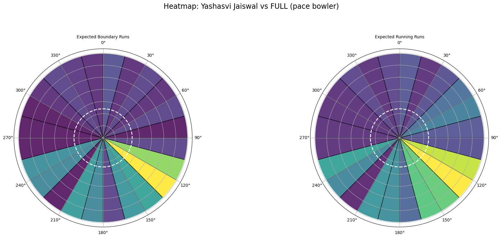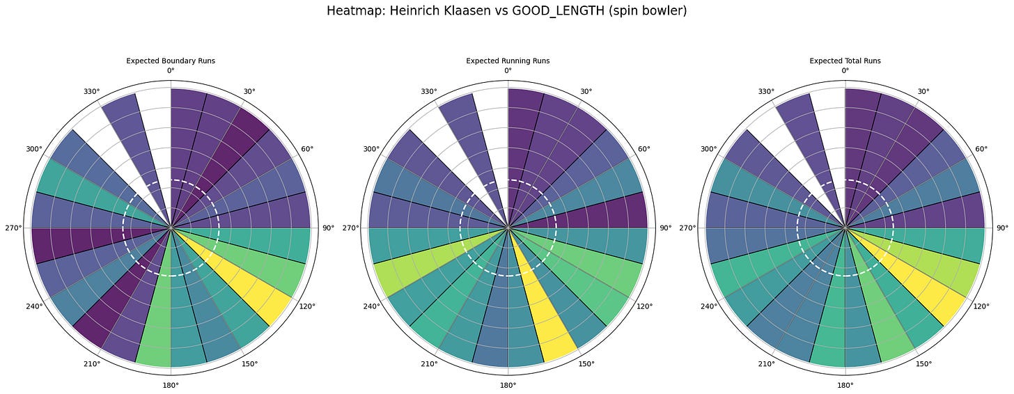 The plot indicates Klaasen’s effective pickup of good-length balls toward deep mid-wicket against spinners. But do we know from expected runs alone how those runs are scored? We will need information regarding the balance between scoring through boundaries and running between the wickets in each sector. Only then can we make decisions, such as whether a fielder is required on the ropes or if we can save an outfielder in that sector. This is achieved by dividing the runs into two classes: the boundary class and the running class. The idea is to know what expected runs could have been stopped by an infielder (running class). The classes are not mutually exclusive, however, because some boundaries—grounded fours—can also be covered by infielders. Due to a lack of data on aerial versus grounded shots, fours have been included with a weight factor of 0.5 in the running class. These are the final classes: