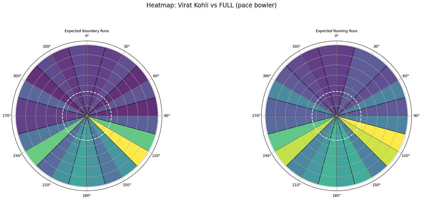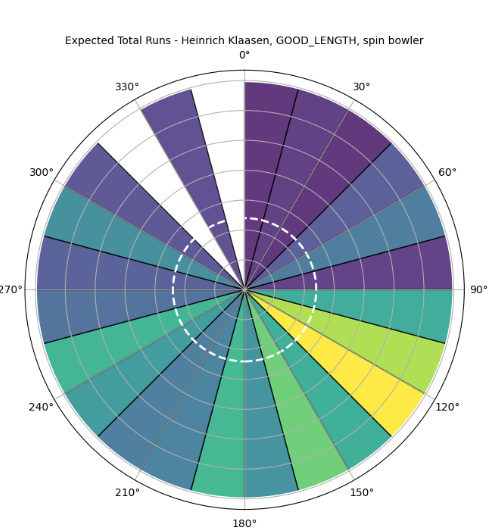 The primary information we need to set a field against any batter is their scoring areas. I am using sectors of a circle here. Twenty-four 15-degree sectors are used. Each sector has an expected run value attached to it (calculated for each length against spin/pace). I also wanted to segregate based on line, but that led to data sparsity.