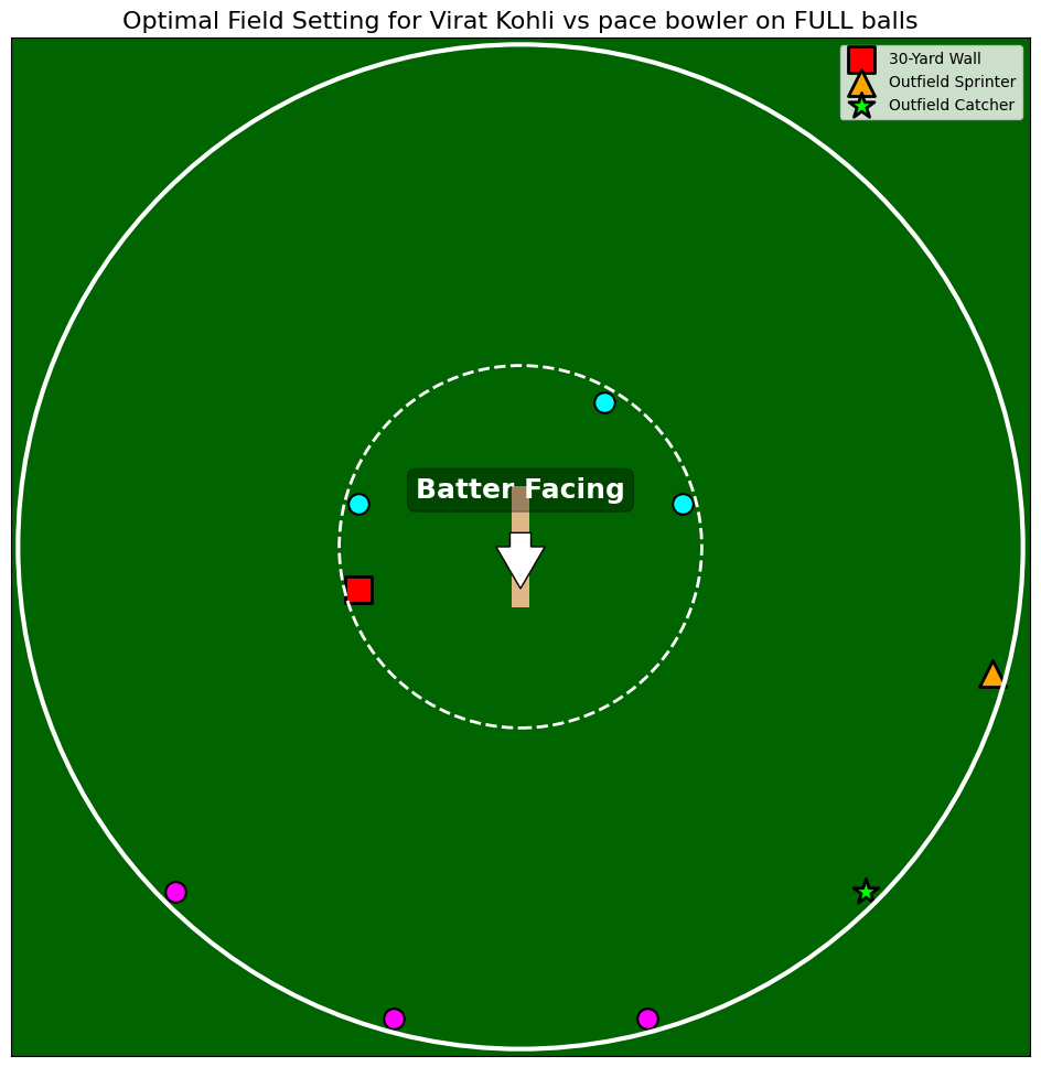 Field settings are just greedy optimizations. You have a fixed number of resources (nine fielders) to work with, and you are mostly looking to maximize the 'runs saved' variable. Defining the problem this way is the first step we can take toward solving field settings using data. Now that the problem is laid out, we move toward the solution. Since our focus is on run-saving, we will only consider the placement of fielders on the 30-yard and boundary circles. Positions like slips or gully are set aside for this analysis