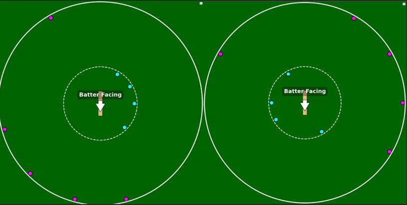 These are two field settings (worst and best) against Rohit Sharma on short-of-good-length deliveries from pacers. There's no prize for guessing which is which. The question is, how much better is the second one? Is there a way to quantify the expected runs saved? I have attempted this here in this piece. The answer is that the second field is expected to cover 73% of Rohit’s runs, compared to just 31% in the first case.
