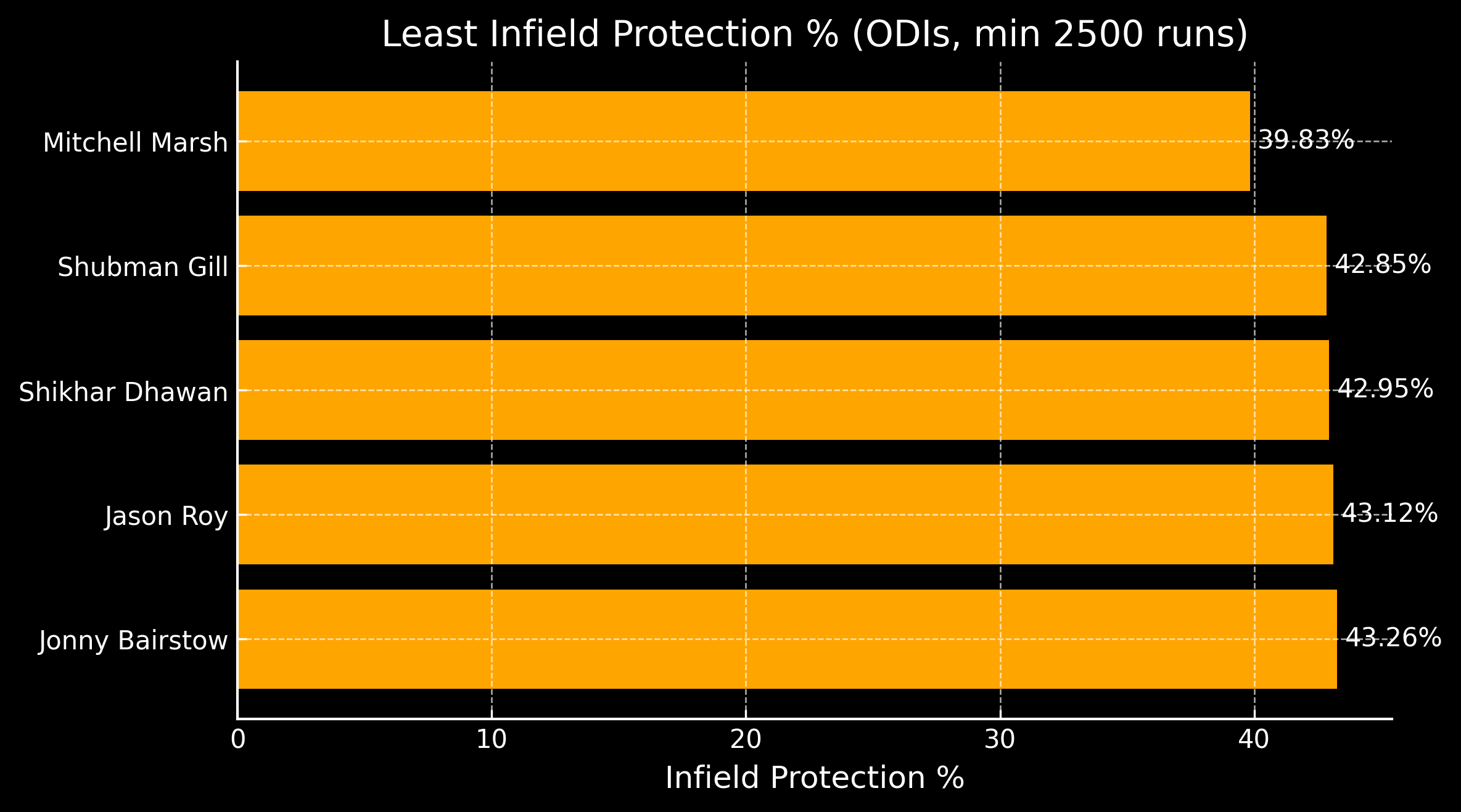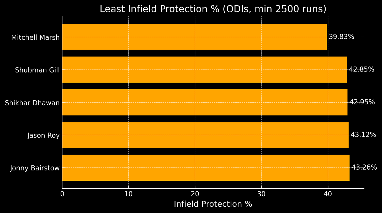 Everyone pretty much agrees that Gill is the most ‘in-control’ white-ball batter in the game today. When we combine these control statistics with the fact that he can cut through the infield for singles at will, we see a batter on the path to becoming an all-time ODI great (if the format survives). Gill’s optimal ODI field setting (in overs 11-40) can only stop 42.85% of his infield game—the second-lowest percentage among batters with a minimum of 2,500 runs.