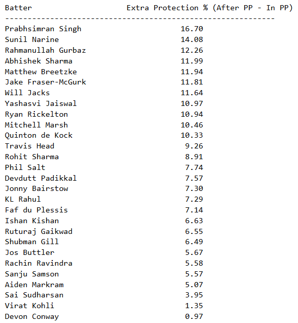 The protection metrics help quantify the effect of fielding restrictions in the Powerplay. We analyze the difference between the Overall Protection Percentage with five outfielders versus two outfielders for openers who have played in the IPL this year. The results reinforce the idea of having boundary hitters in the Powerplay because of the low protection they have to deal with for their game. A batter with a high running class percentage won't benefit much from the field restrictions. We see this in the low "extra protection" that fielding sides get against batters like Conway and Kohli once the Powerplay is over. Aggressive batters tend to get an average 10% boost from facing less protection in the Powerplay. This explains why a Narine at the top was a progressive move at the time.